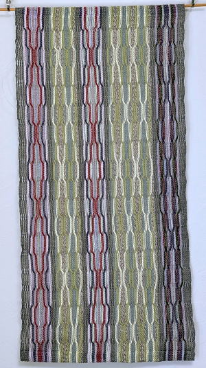 私が使っている織り機「咲きおり」は、途中でたて糸が外せるので、たて糸を交差させて模様を作ることを、かなり以前、織りを始めてあまり経っていないころに始めました。