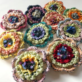 いろいろと気分が落ちてしまうので、何かきれいなものを作りたくて、毛糸でお花のブローチを編んでみました。
