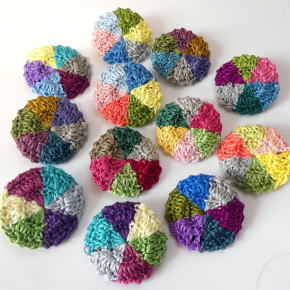 刺繍糸の編み物をしようと片付けていたら、色合わせがしたくなり、コースターなどを編んでいる6色で編み分ける方法で、ブローチを編んでみました。