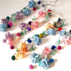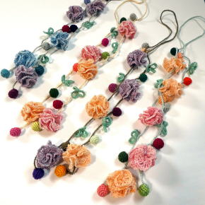 手編みのブローチ、スリーピン、シュシュ、ストラップなど、いろいろ作っています。